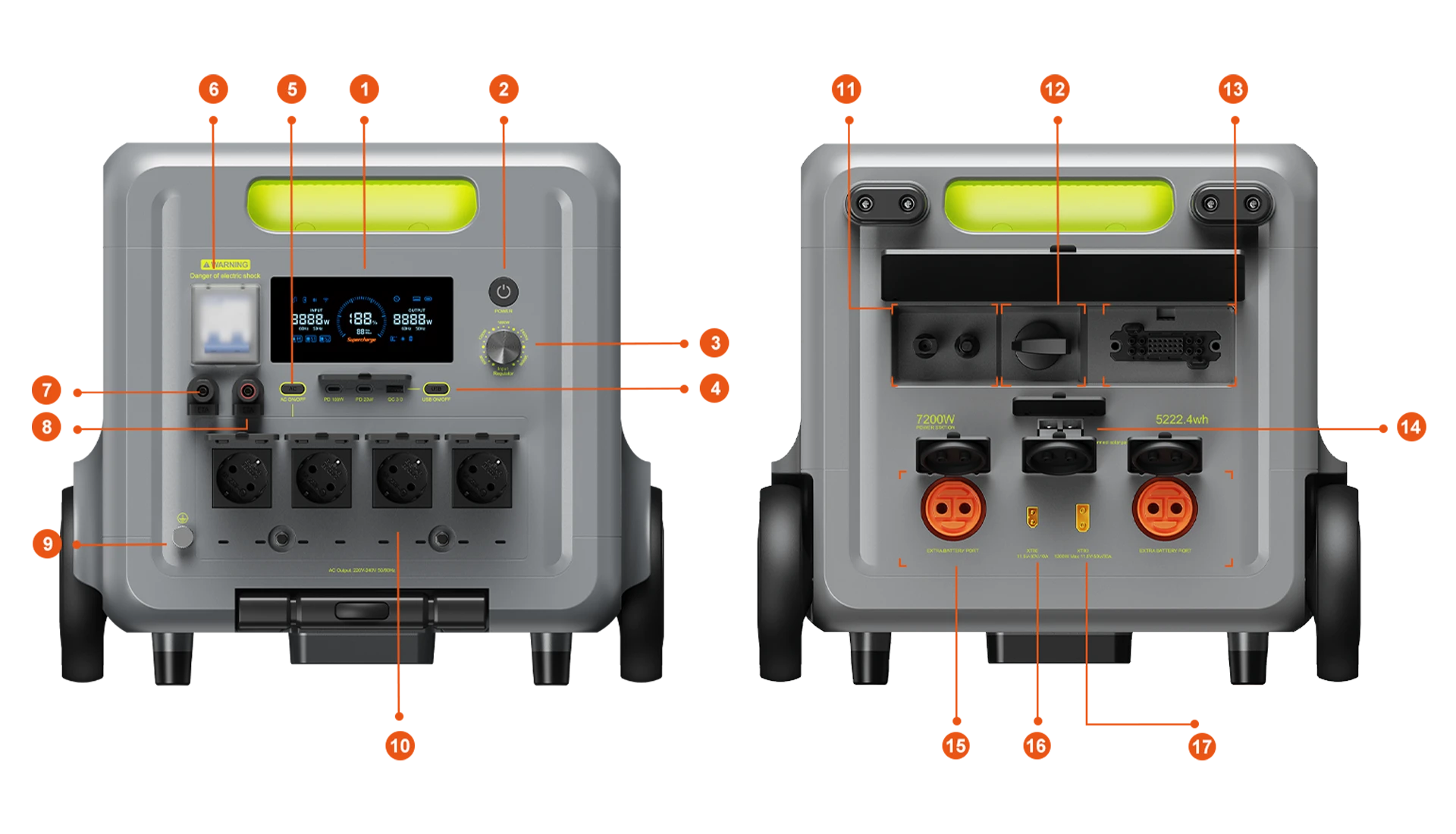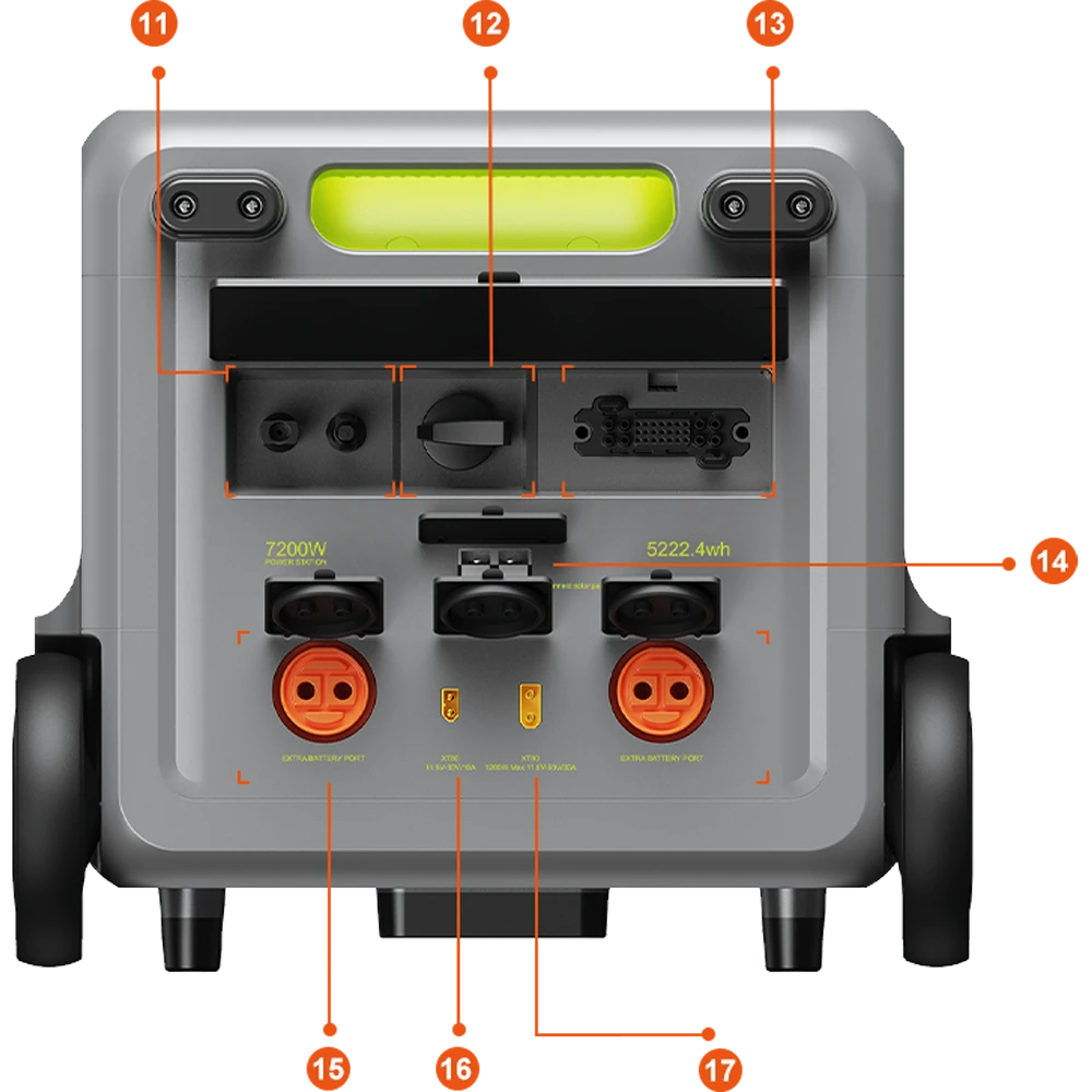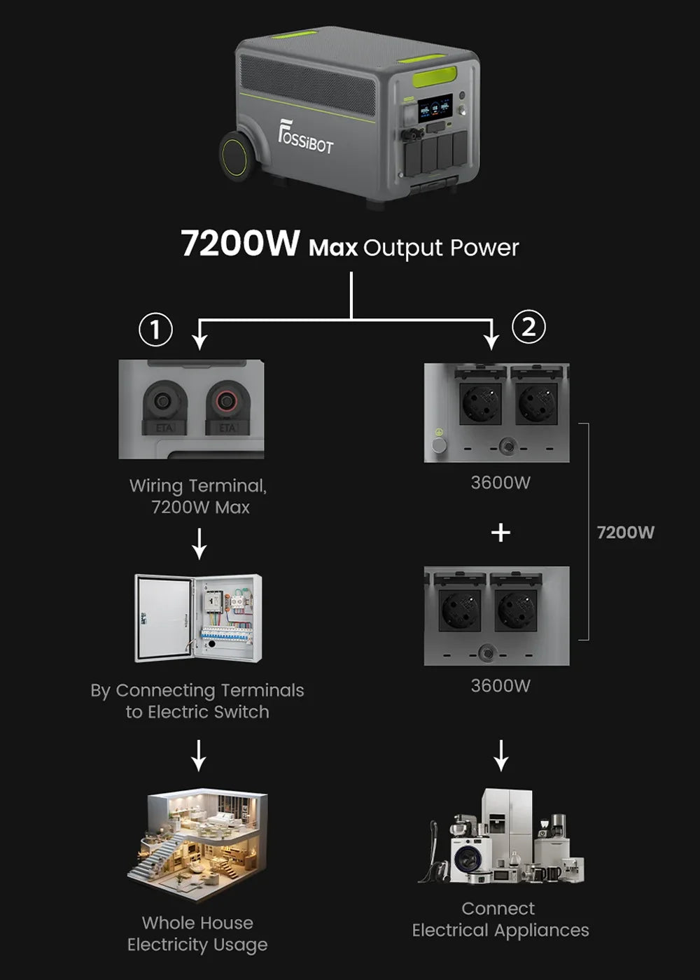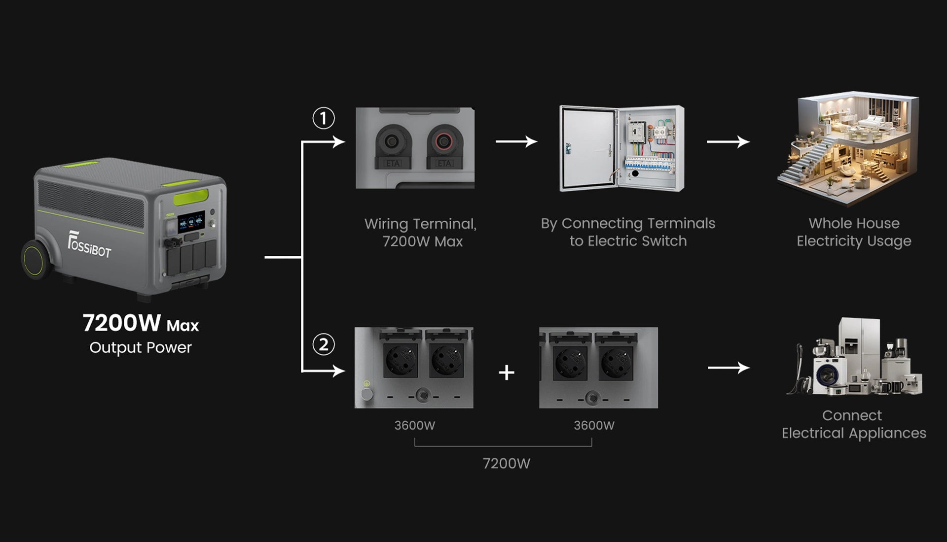 Erhalte eine maximale Ausgangsleistung von 7200W auf zwei Arten: Nutze die beiden Gruppen von 3600W-AC-Ausgängen oder verbinde die F7200 über Anschlussklemmen mit deinem Hausstromschalter für eine 7200W-Gesamthausstromversorgung.