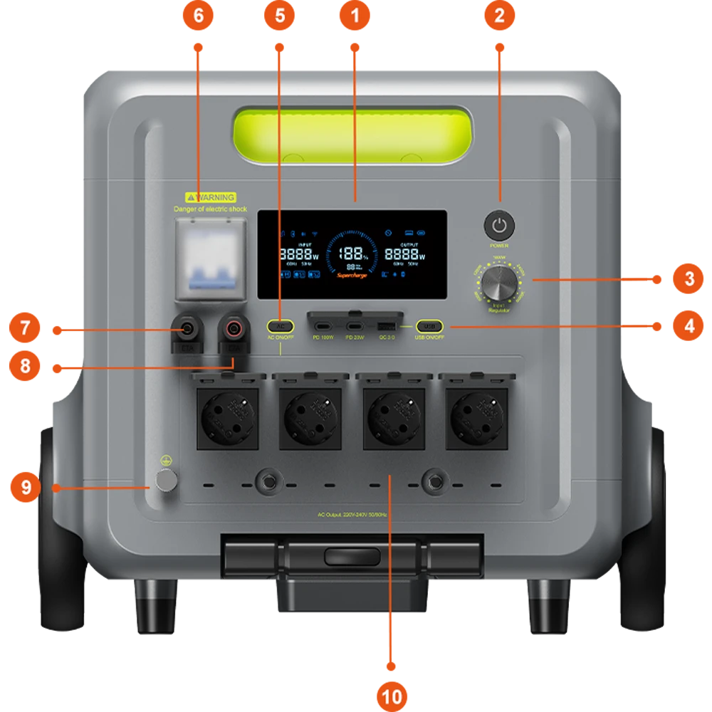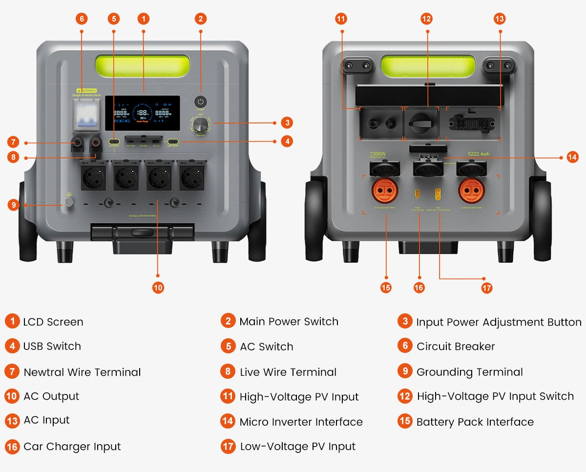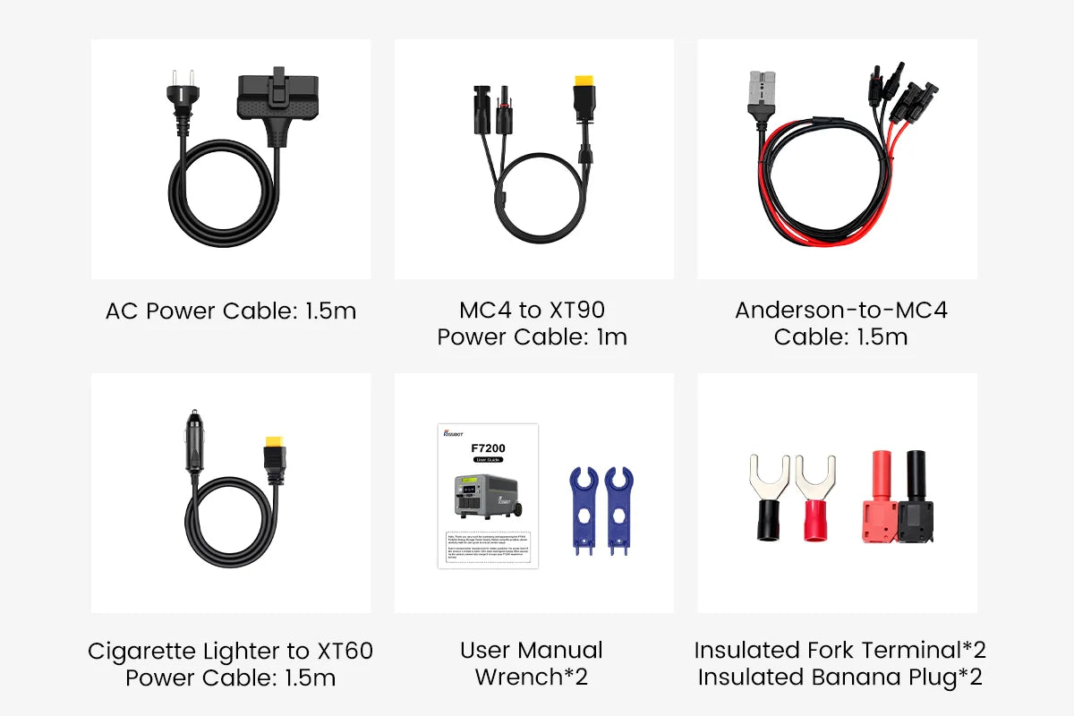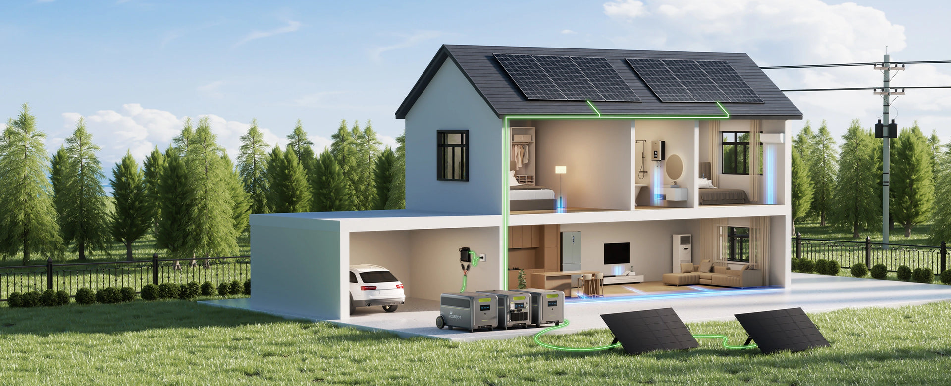 Erhalte eine maximale Ausgangsleistung von 7200W auf zwei Arten: Nutze die beiden Gruppen von 3600W-AC-Ausgängen oder verbinde die F7200 über Anschlussklemmen mit deinem Hausstromschalter für eine 7200W-Gesamthausstromversorgung.